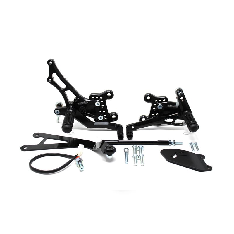 Adjustable Type 1.5 rearsets are developed for street/racing use, entirely made with CNC machinery in Ergal 7075 T5 alloy. Footpegs and frontpegs are made in aluminum alloy machined to obtain an optimal grip. Shift and brake levers are mounted on two ball bearings to avoid any friction. Adjustable plates allows from 6 to 9 different positions to find the best feeling on the bike. Rearsets are provided with black aluminum heel protections, the correct lenght shift rod, shift and brake ball joints, brake light pressure switch. Rearsets with reverse shift.