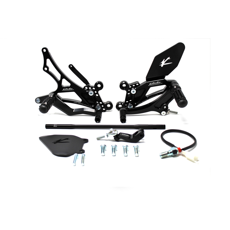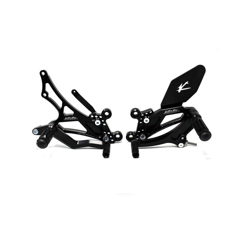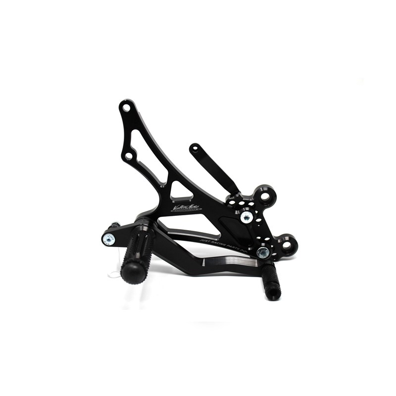 Adjustable Type 1.5 rearsets are developed for street/racing use, entirely made with CNC machinery in Ergal 7075 T5 alloy. Footpegs and frontpegs are made in aluminum alloy machined to obtain an optimal grip. Shift and brake levers are mounted on two ball bearings to avoid any friction. Adjustable plates allows from 6 to 9 different positions to find the best feeling on the bike. Rearsets are provided with black aluminum heel protections, the correct lenght shift rod, shift and brake ball joints, brake light pressure switch. All spare parts are available.