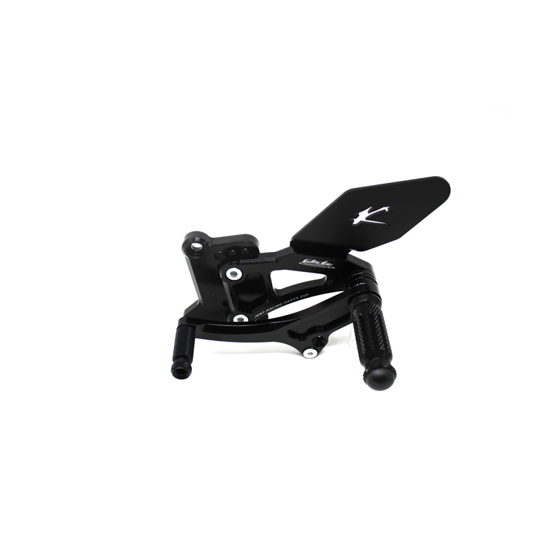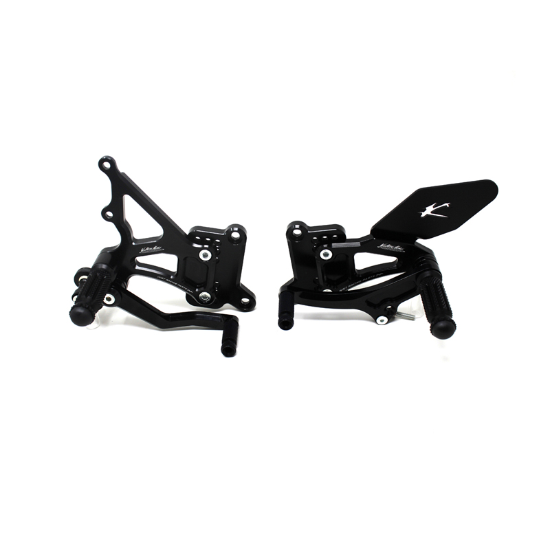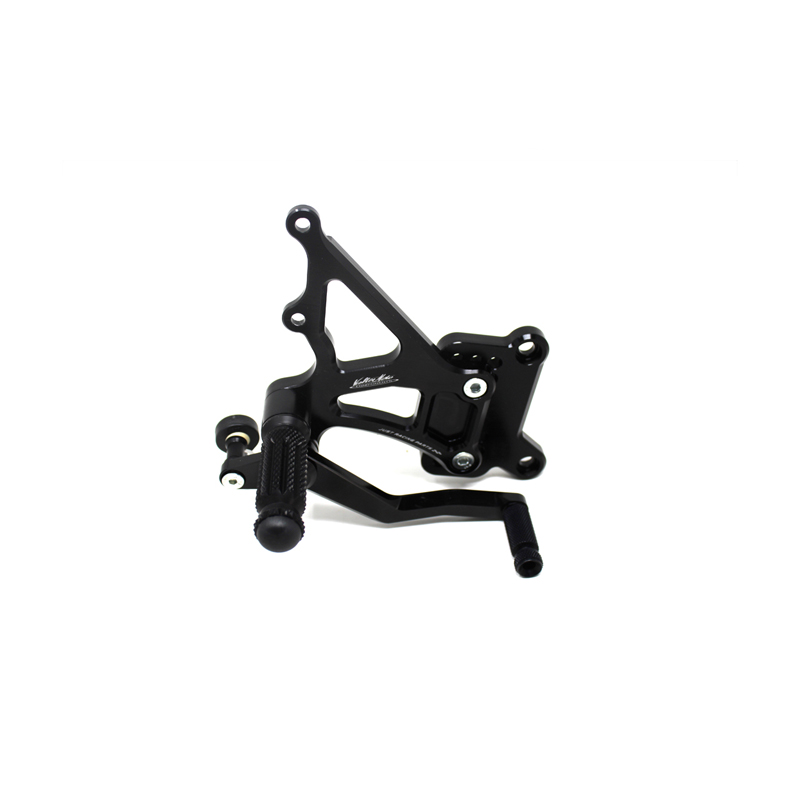 Adjustable Type 1.5 rearsets are developed for street/racing use, entirely made with CNC machinery in Ergal 7075 T5 alloy. Footpegs and frontpegs are made in aluminum alloy machined to obtain an optimal grip. Shift and brake levers are mounted on two ball bearings to avoid any friction. Adjustable plates allows from 6 to 9 different positions to find the best feeling on the bike. Rearsets are provided with black aluminum heel protections, the correct lenght shift rod, shift and brake ball joints, brake light pressure switch. All spare parts are available. TÜV approved KBA homologated with ABE number.