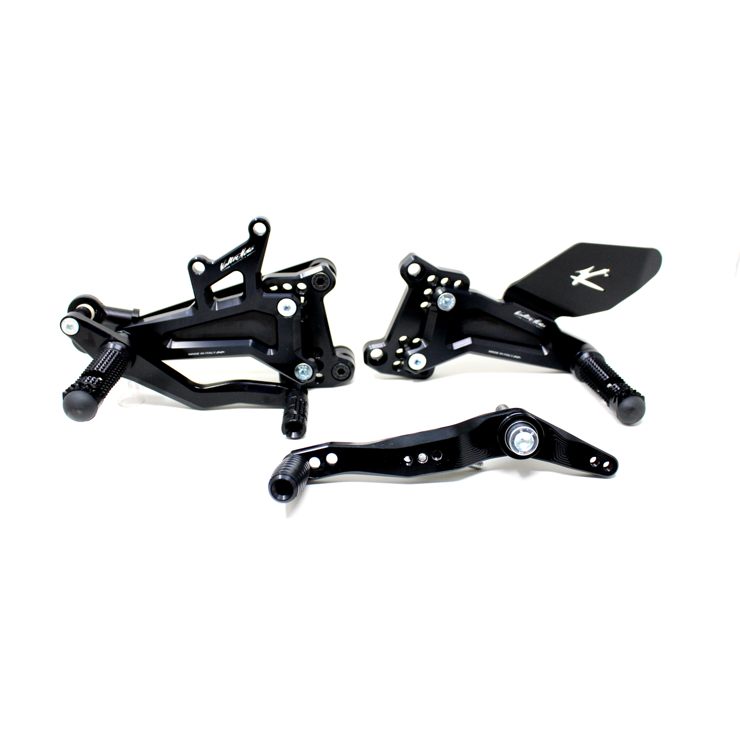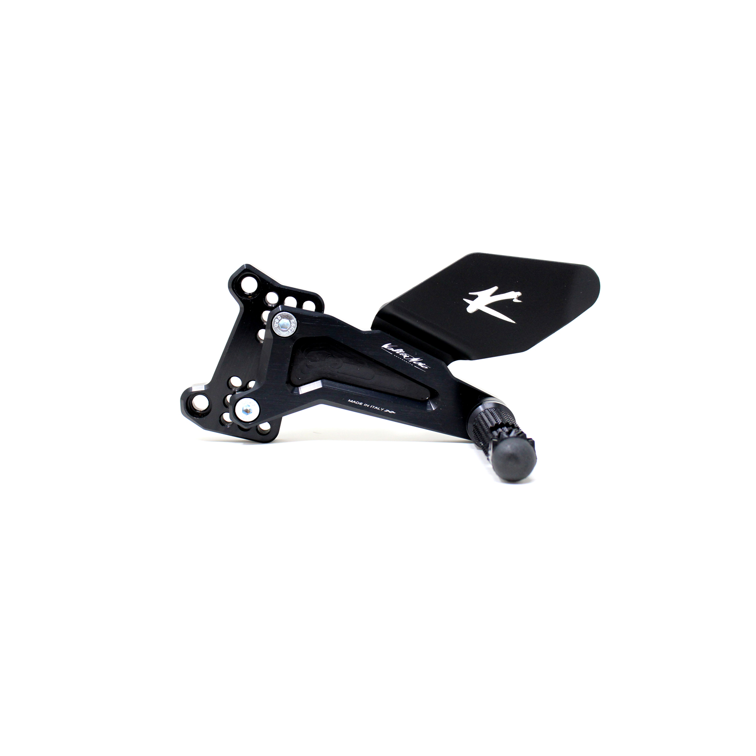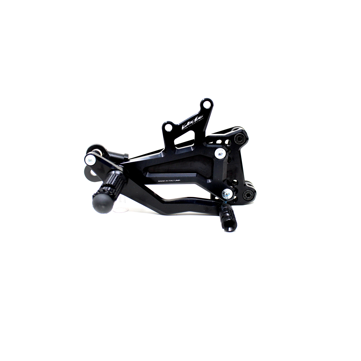 Adjustable Type 1.5 rearsets are developed for street/racing use, entirely made with CNC machinery in Ergal 7075 T5 alloy. Footpegs and frontpegs are made in aluminum alloy machined to obtain an optimal grip. Shift and brake levers are mounted on two ball bearings to avoid any friction. Adjustable plates allows from 6 to 9 different positions to find the best feeling on the bike. Rearsets are provided with black aluminum heel protections, the correct lenght shift rod, shift and brake ball joints, brake light pressure switch.