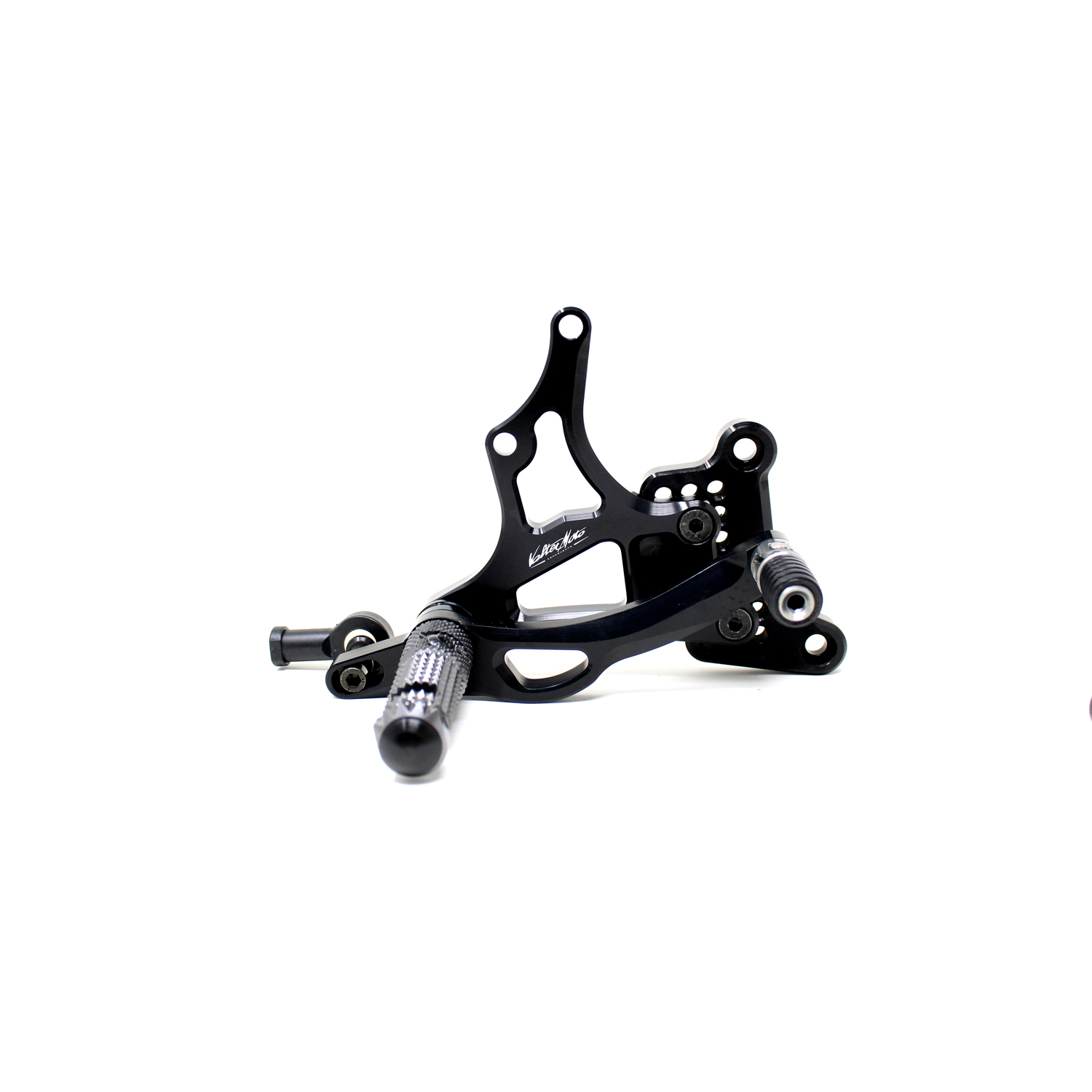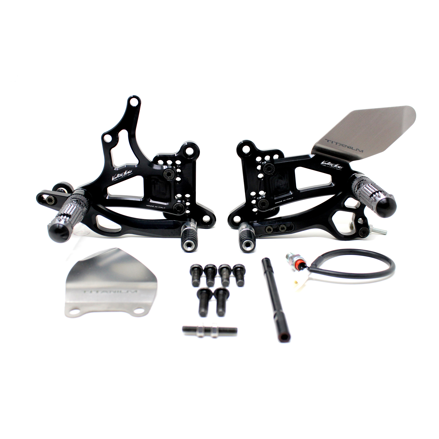 Adjustable Type 3.5 rearsets are developed mainly for racing use, are entirely made with CNC machinery in Ergal 7075 T5 alloy and are the Top Range model used in the most important world racing championships. Aluminium high grip footpegs are provided with nylon caps, they are both fold up but it is possible to block them in standard position by the steel pin included. Aluminum fix frontpegs are more ergonomic and easy for braking and shifting; Shift and brake levers are lightened, allows to adjust both sensibility and they are mounted on two ball bearings to avoid any friction. Shift frontpeg has a special rail system to adjust lenght position approximately 10 mm. Drilled plates allows from 6 to 9 different positions to find the best position on the bike. Rearsets are equipped with exclusive Titanium Line heel protections and provided with the correct lenght shift rod, ball joints and brake light pressure switch. All spare parts are available.