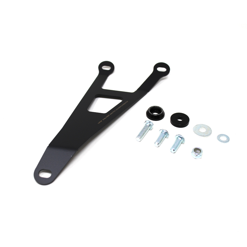 Steel muffler bracket developed with professional racing Team easy to mount instead of OEM part. Lighter than OEM bracket is available in matte black color only and provided with an aluminum conical spacer marked Valter Moto Components.