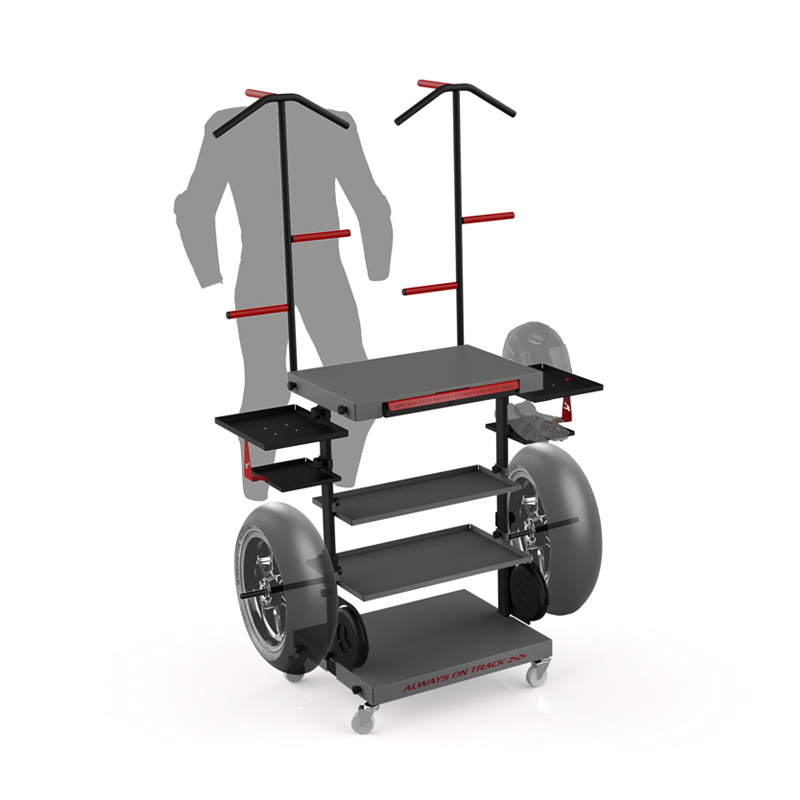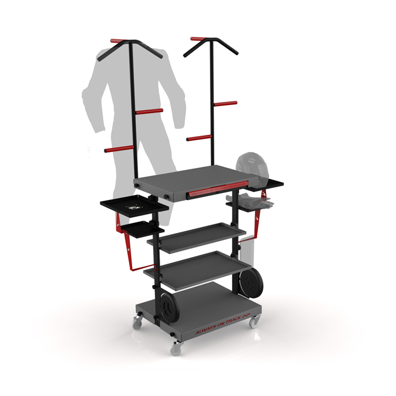 Struttura interamente montabile grazie a pomelli. Incluso nel kit vengono forniti 4 piedini gommati e 4 ruote. Il banchetto è composto da due mensole centrali di diverse dimensioni e un cassetto con serratura per riporre in sicurezza gli oggetti personali. Due supporti avvitabili per posizionare le ruote non utilizzate e una coppiglia evita la caduta accidentale del cerchio. L'altezza è stata progettata per posizionare le termocoporte sulla gomma. Una mensola laterale è composta da un supporto casco 26*36 senza ventilazione per il casco, supporto per guanti e un supporto per termocoperte. È tutto avvitabile mediante pomelli. Possibilità di scelta se posizionare a destra o sinistra del banchetto. Kit per supportare due cavalletti. Gommatura rossa anti-graffio. E' possibile avvitare la struttura per appendere la tuta, al banchetto tramite pomello.