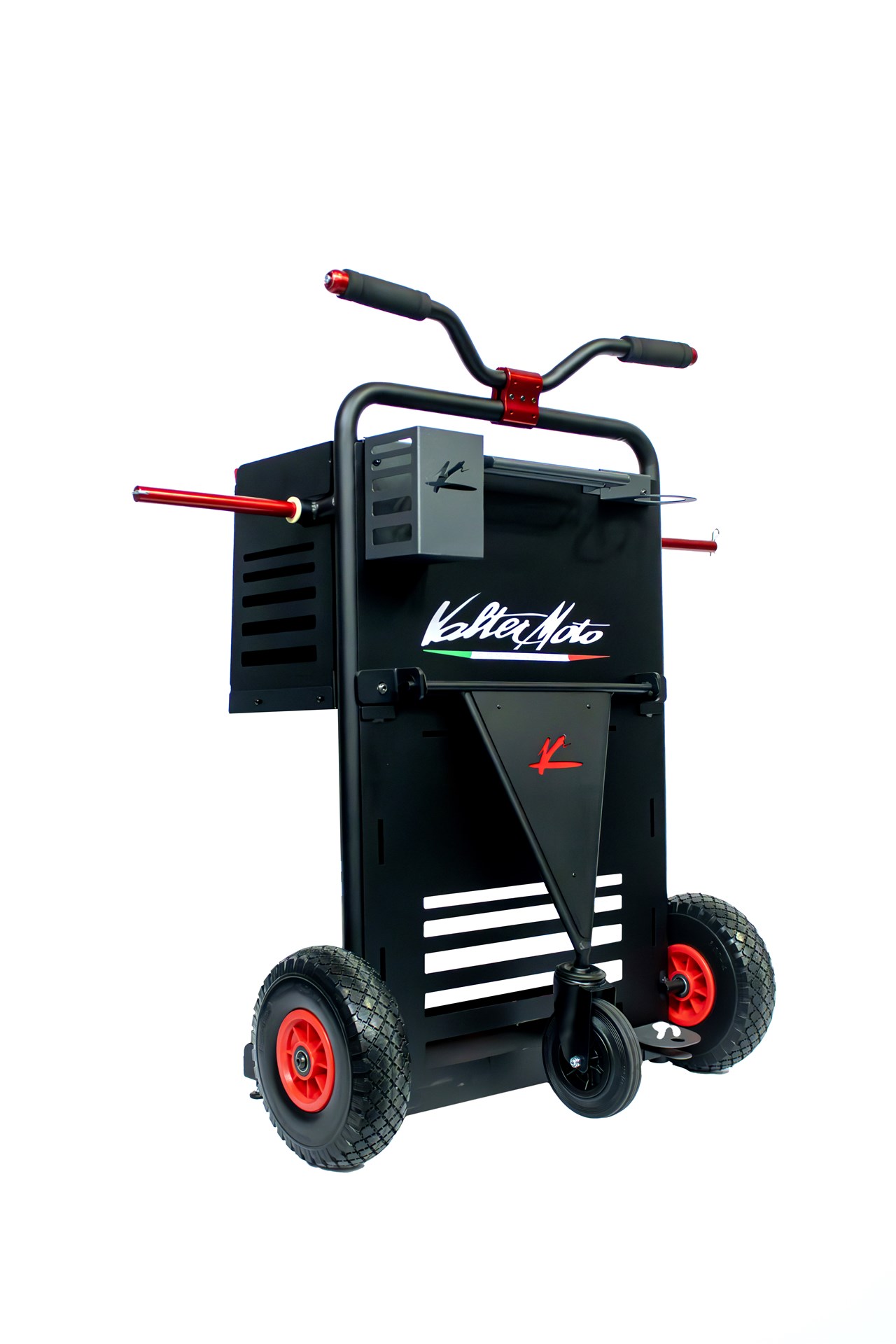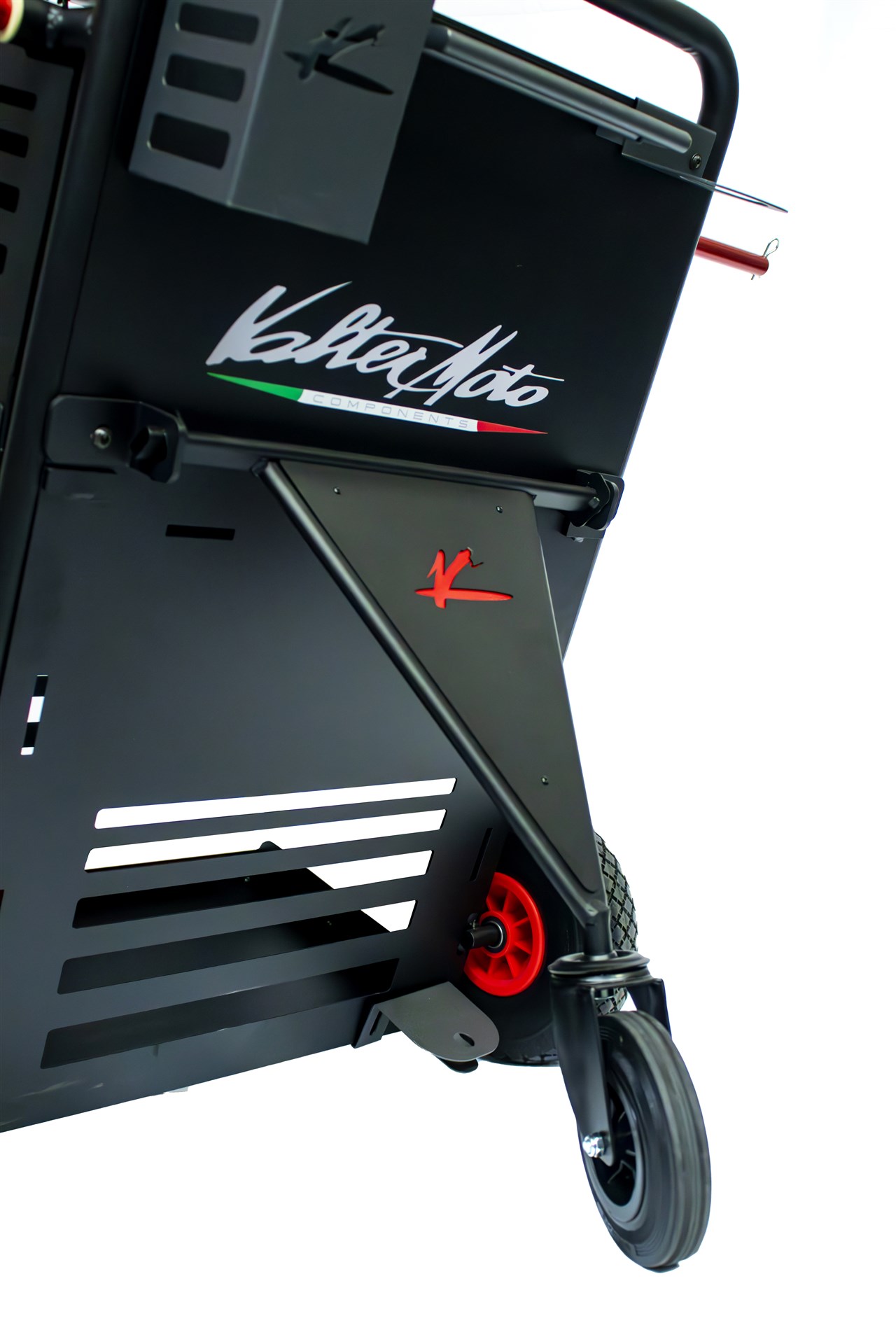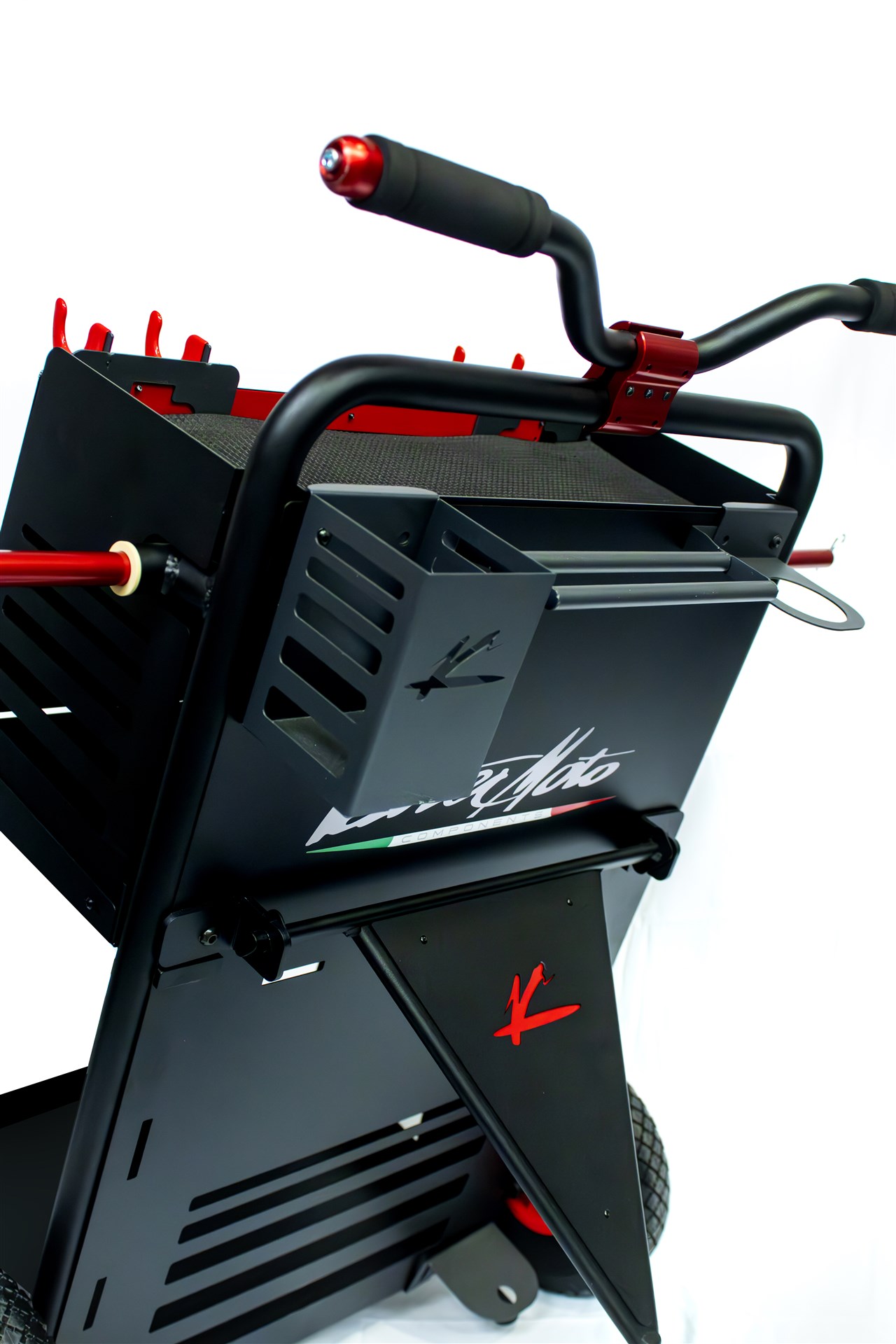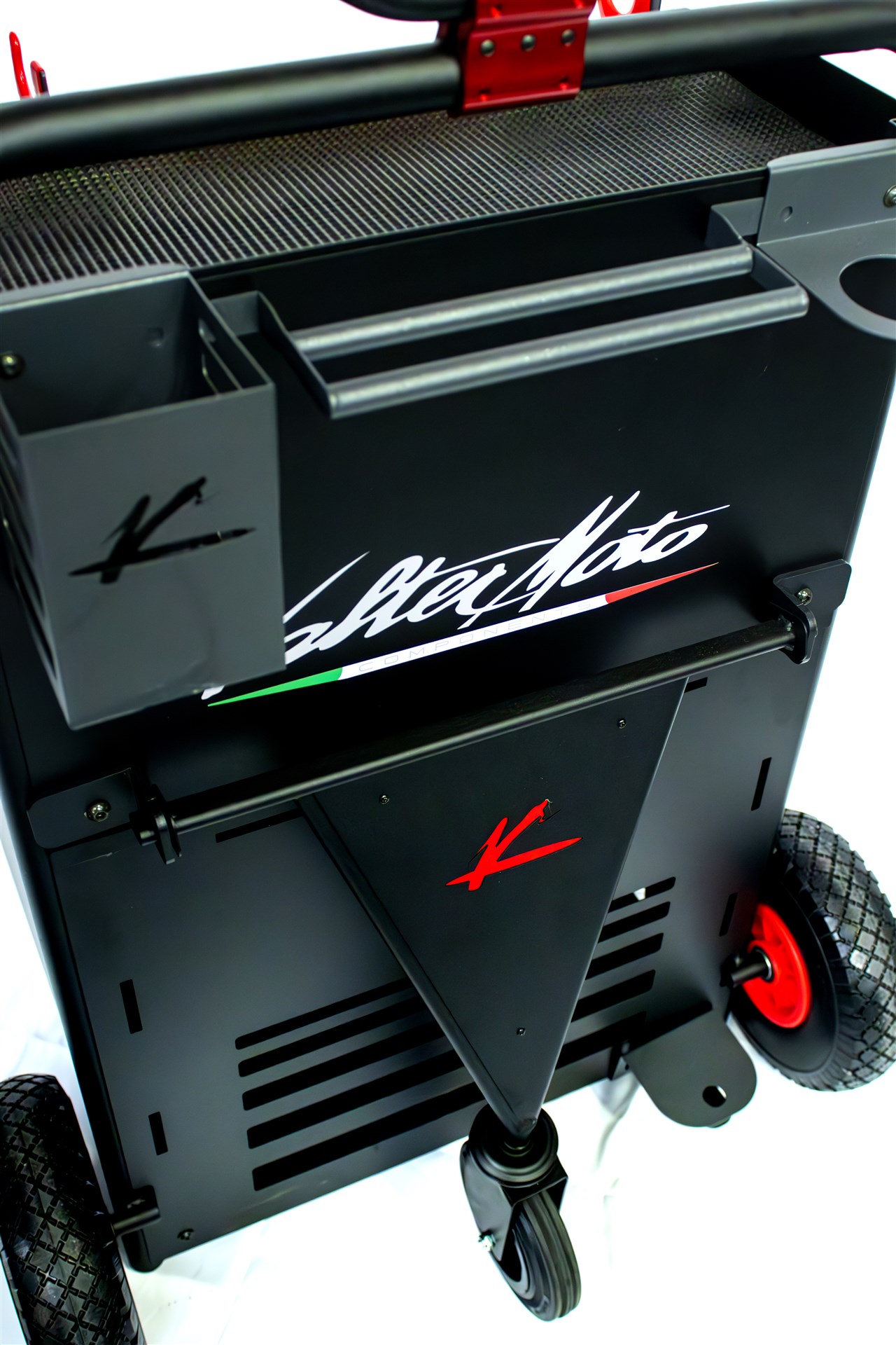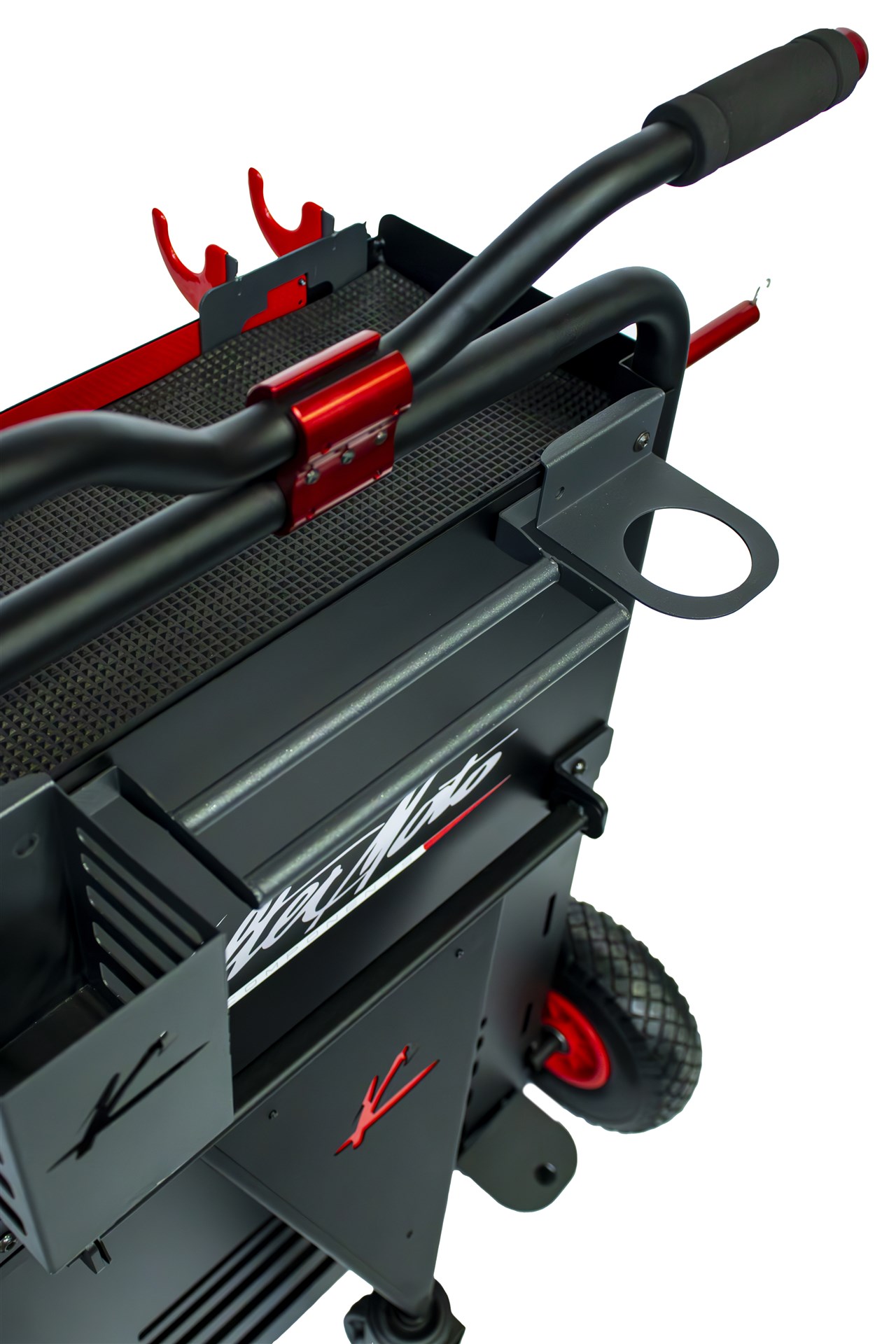 Il nuovo carrello Pit Lane Monster a tre ruote è stato realizzato per agevolare il trasporto in pista di tutto l’occorrente necessario e grazie al meccanismo della terza ruota tutto il peso viene sostenuto dal carrello eliminando così gli sforzi durante il trasporto. La ruota pivottante permette di curvare comodamente agevolando le manovre e il trasporto in pista. Dispone di un supporto per trasportare due cavalletti con possibilità di fissaggio tramite due laccetti gommati. Comprende anche un porta borraccia per il pilota, un porta ombrello e un porta cerchi anodizzato rosso. Grazie alle manopole in spugna è più comoda l’impugnatura al manubrio e i terminali manubrio in ergal enfatizzano l’estetica del carrello pit lane.