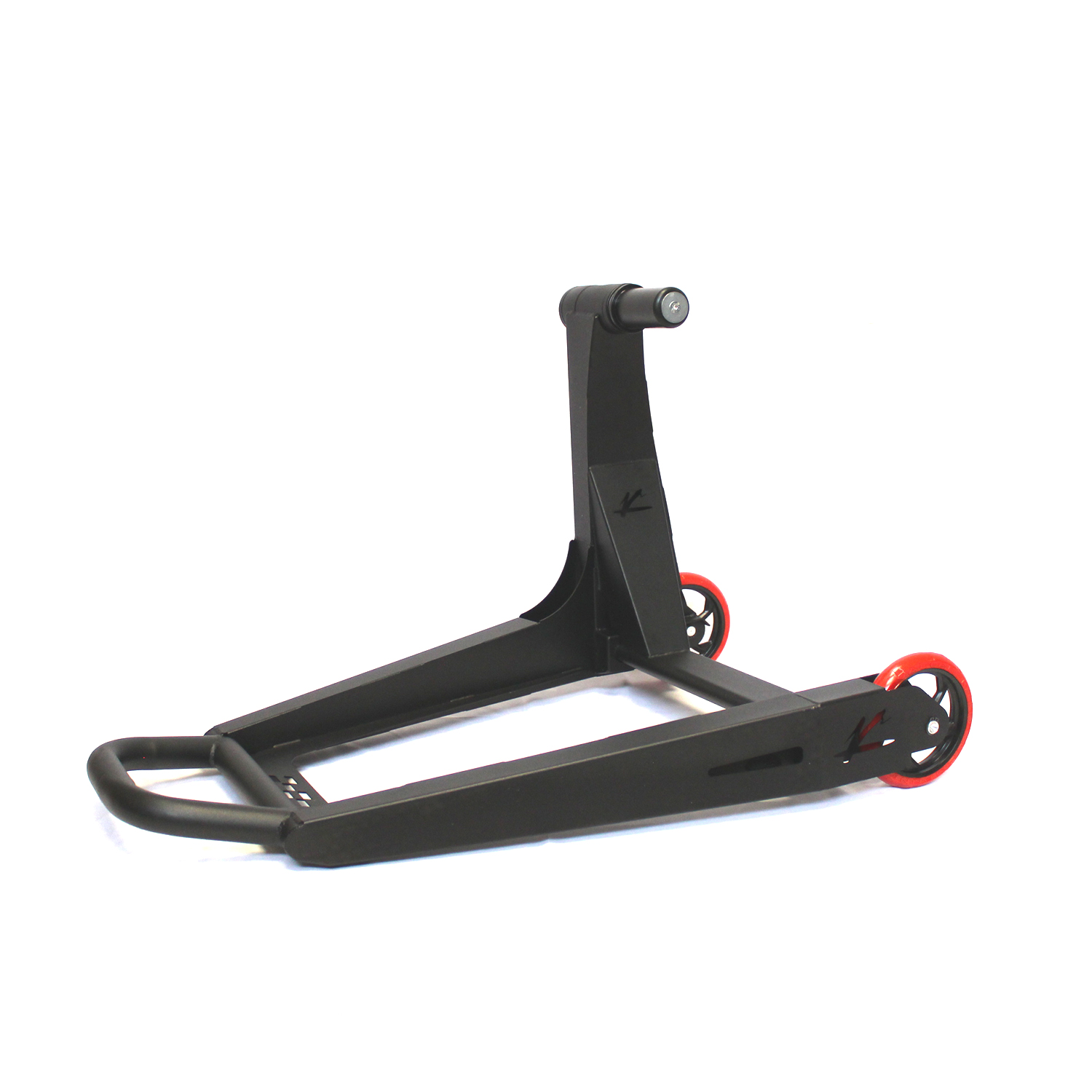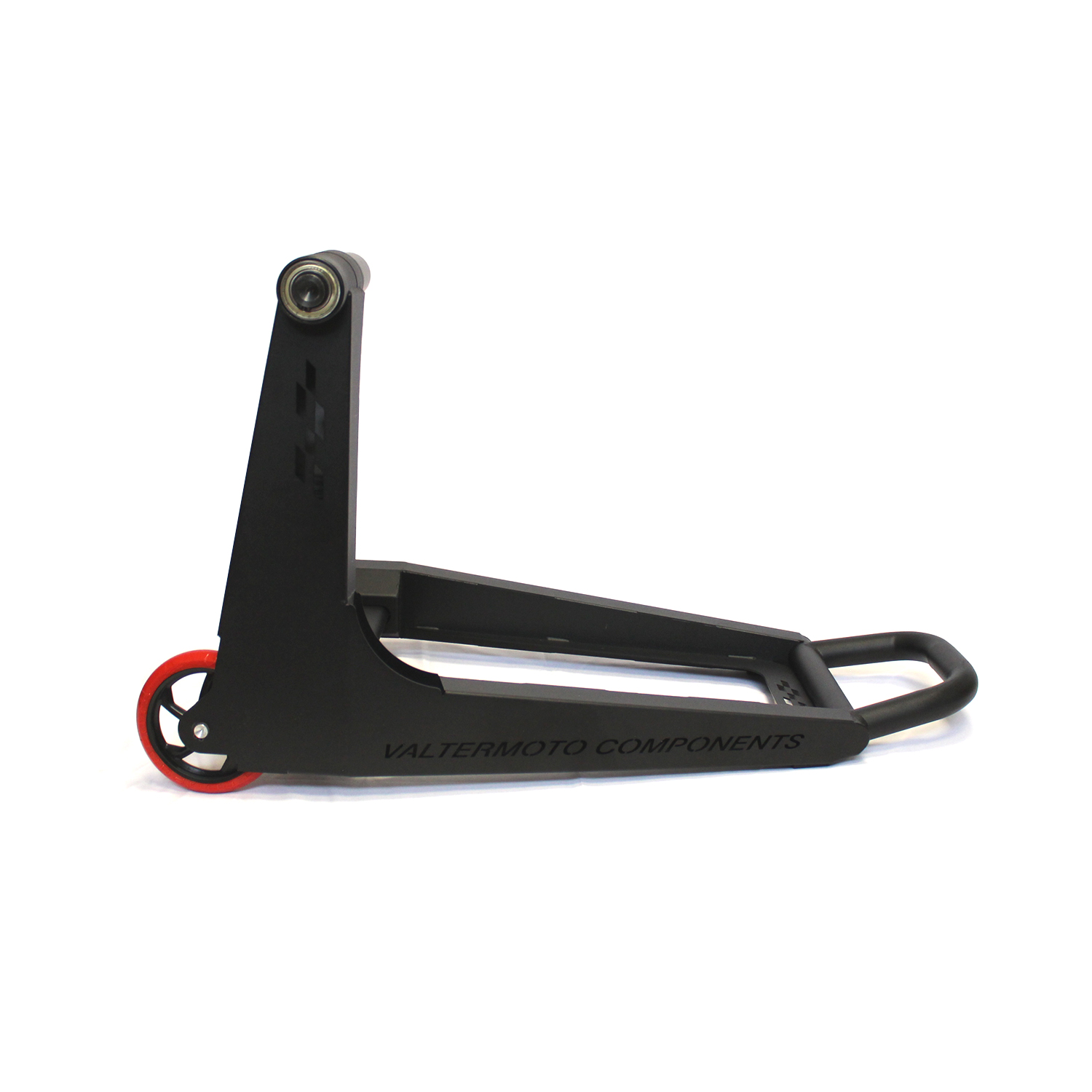 Questo cavalletto posteriore è stato sviluppato per essere quello più resistente della linea di cavalletti VMC. È interamente realizzato da un unico foglio di alluminio piegato e saldato a mano. È largamente utilizzato da molti Team per via del peso ridotto e dal design unico nel suo genere. È equipaggiato con due ruote realizzate in esclusiva su design VMC. Può essere utilizzato con tutti i modelli di moto che hanno il forcellone monobraccio sinistro. Il perno con diametro specifico per i diversi modelli di moto viene venduto separatamente.