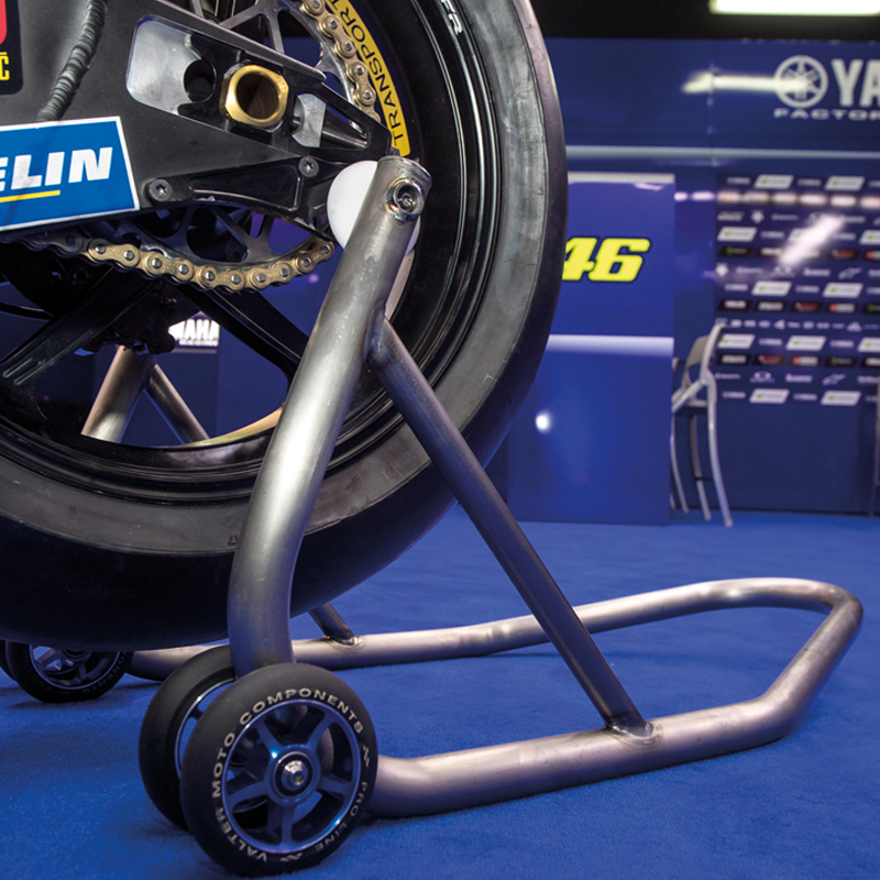 Il cavalletto posteriore Endurance in Titanio è utilizzato da molti Team in diversi campionati mondiali e nazionali. Questa tipologia di cavalletto può essere usata solamente se sono presenti le speciali forchette di sollevamento montate sul forcellone della moto. È interamente realizzato con tubi in Titanio saldati a mano per offrire la massima qualità e leggerezza garantendo la durata nel tempo. È equipaggiato con 4 ruote in alluminio montate su microcuscinetti e fissate alla struttura con viti in Titanio. La larghezza del cavalletto è regolabile manualmente per l'utilizzo su tutte le moto di media/alta cilindrata. KG 2,50