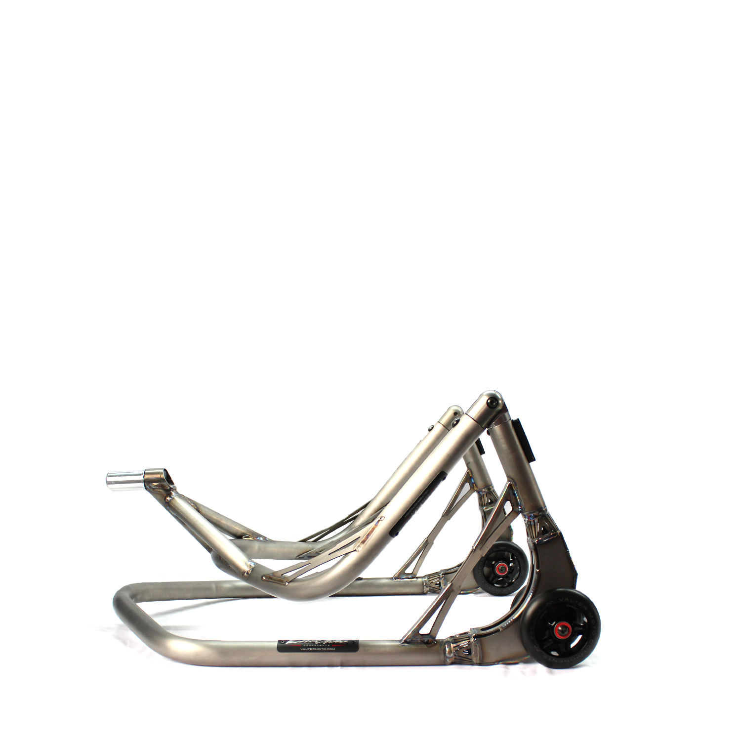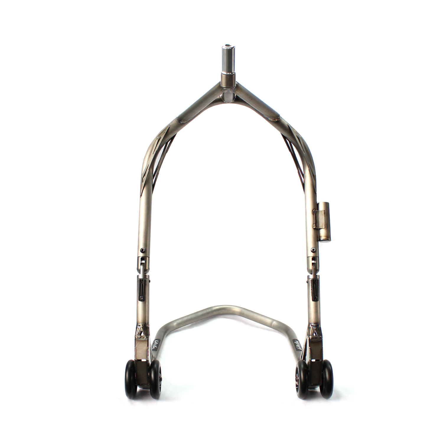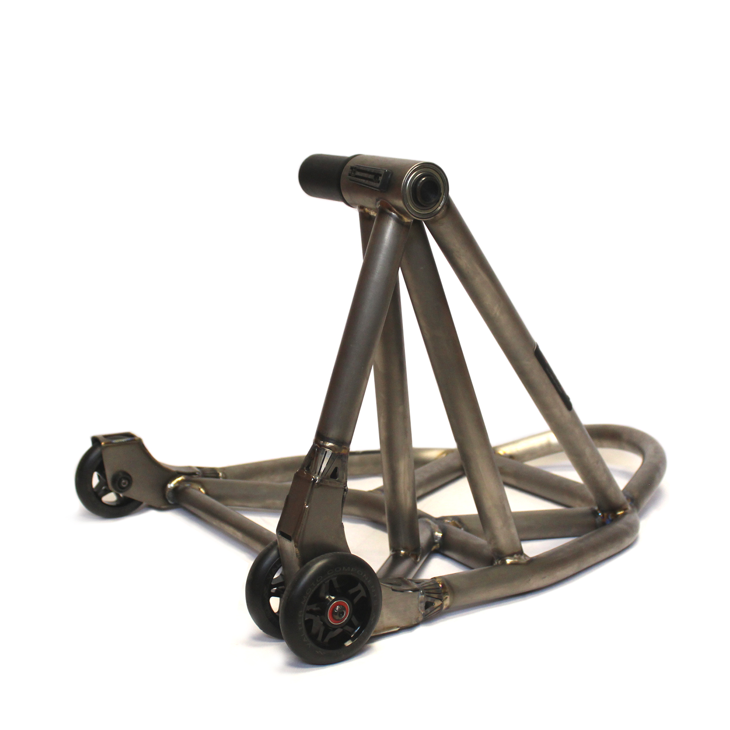 Il cavalletto sottocannotto in Titanio è utilizzato da molti Team in diversi campionati mondiali e nazionali. Questa tipologia di cavalletto permette allo specialista di intervenire liberamente sulla ruota anteriore e sulle forcelle perché permette il sollevamento della moto direttamente dal foro del cannotto di sterzo. È interamente realizzato con tubi e snodi in Titanio saldati a mano per offrire la massima qualità e leggerezza garantendo una lunga durata nel tempo. È equipaggiato con 4 ruote in alluminio montate su microcuscinetti e fissate alla struttura con viti in Titanio. Attenzione: i perni in Titanio dei diversi diametri non sono inclusi e vengono venduti separatamente. KG 3,50