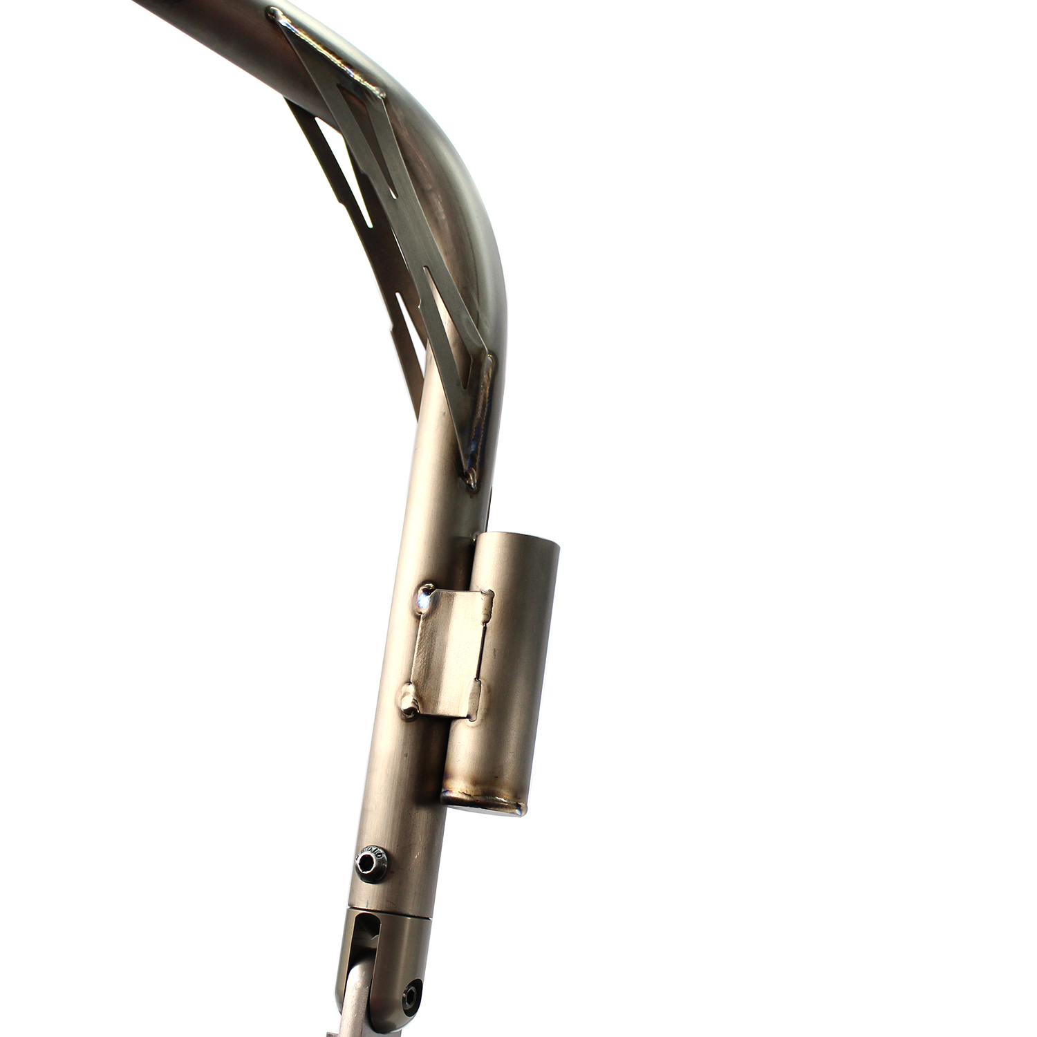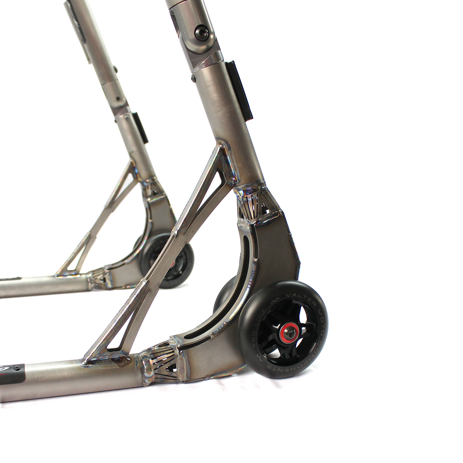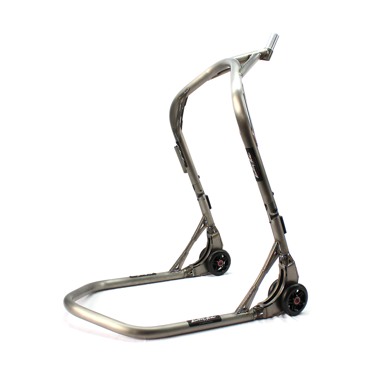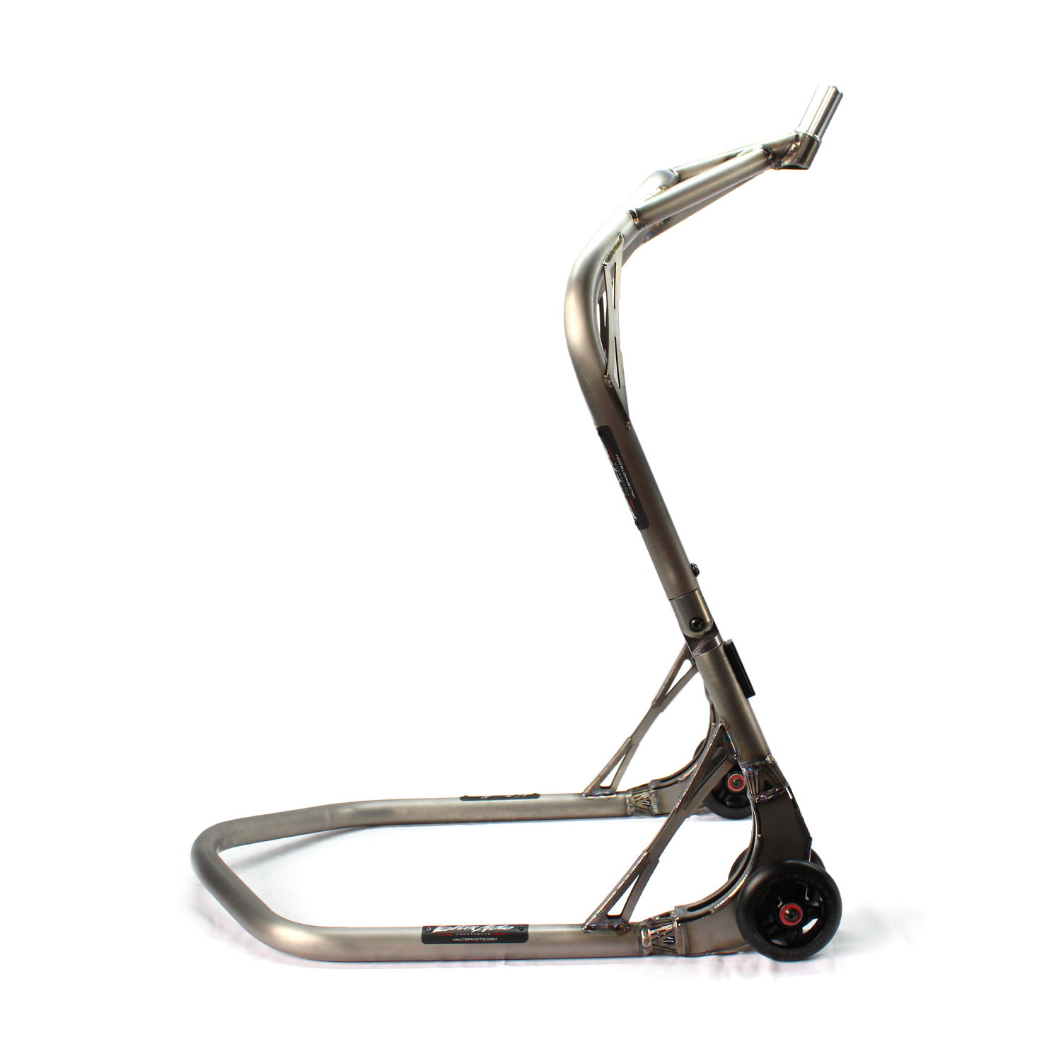 Il cavalletto sottocannotto in Titanio è utilizzato da molti Team in diversi campionati mondiali e nazionali. Questa tipologia di cavalletto permette allo specialista di intervenire liberamente sulla ruota anteriore e sulle forcelle perché permette il sollevamento della moto direttamente dal foro del cannotto di sterzo. È interamente realizzato con tubi e snodi in Titanio saldati a mano per offrire la massima qualità e leggerezza garantendo una lunga durata nel tempo. È equipaggiato con 4 ruote in alluminio montate su microcuscinetti e fissate alla struttura con viti in Titanio. Attenzione: i perni in Titanio dei diversi diametri non sono inclusi e vengono venduti separatamente. KG 3,50