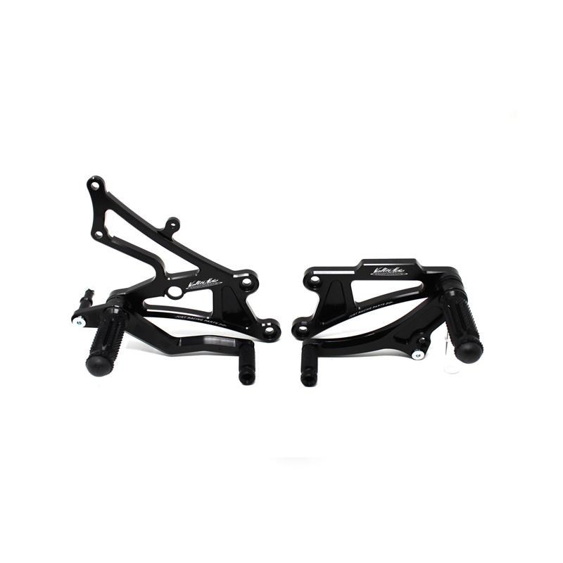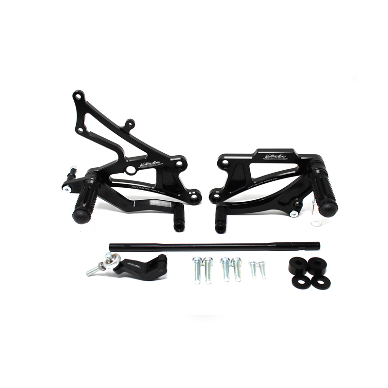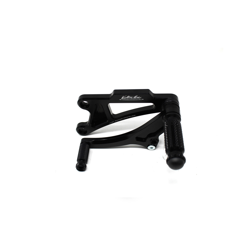 Interamente realizzate in Ergal 7075 T5 lavorato su centri di lavoro CNC questo modello di pedane è stato sviluppato per un uso stradale e pista. I poggiapiedi e i puntalini in alluminio sono lavorati per garantire un grip ottimale. La leva freno è montata su 2 cuscinetti a sfera per ridurre al minimo l'attrito. Il kit comprende tutta la viteria necessaria per il montaggio, l'asta cambio della corretta lunghezza e gli snodi sferici lato cambio e lato freno. Per le pedane VMC sono sempre disponibili tutti i ricambi. Possibilità di montare le alette paratacco.