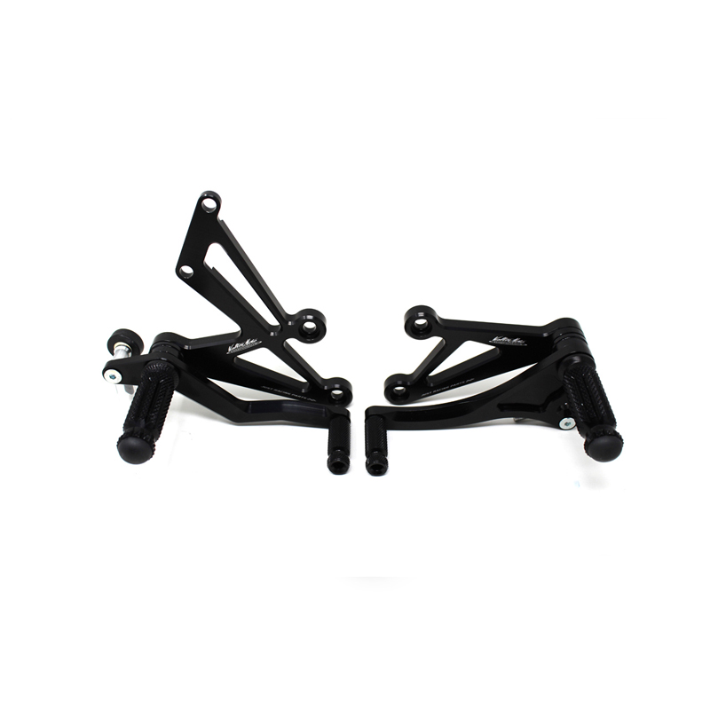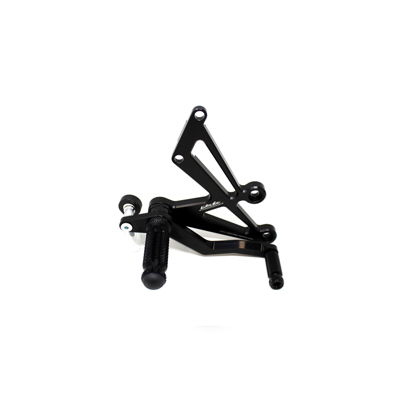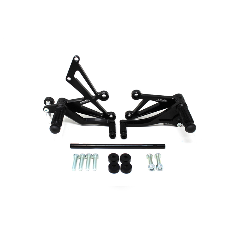 Interamente realizzate in Ergal 7075 T5 lavorato su centri di lavoro CNC questo modello di pedane è stato sviluppato per un uso stradale e pista. I poggiapiedi e i puntalini in alluminio sono lavorati per garantire un grip ottimale. La leva freno è montata su 2 cuscinetti a sfera per ridurre al minimo l'attrito. Il kit comprende tutta la viteria necessaria per il montaggio, l'asta cambio della corretta lunghezza e gli snodi sferici lato cambio e lato freno. Per le pedane VMC sono sempre disponibili tutti i ricambi. Possibilità di montare le alette paratacco.