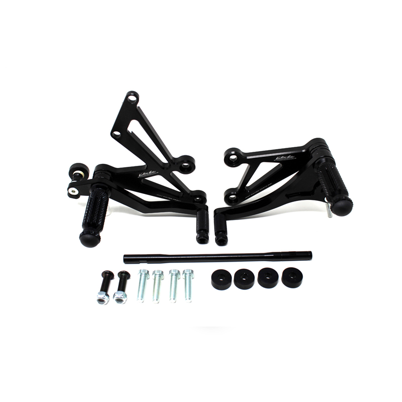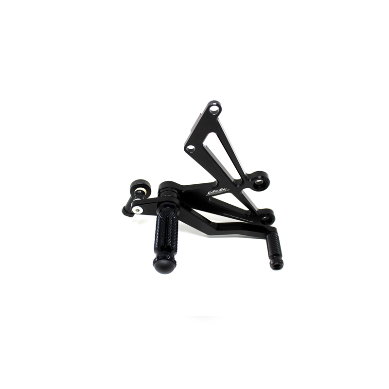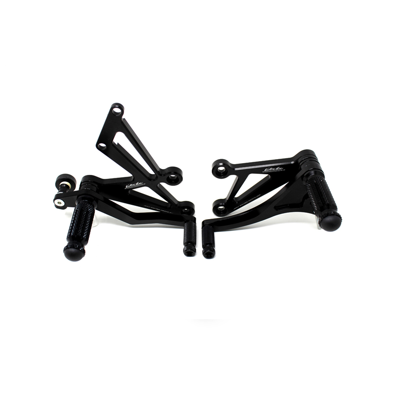 Interamente realizzate in Ergal 7075 T5 lavorato su centri di lavoro CNC questo modello di pedane è stato sviluppato per un uso stradale e pista. I poggiapiedi e i puntalini in alluminio sono lavorati per garantire un grip ottimale. La leva freno è montata su 2 cuscinetti a sfera per ridurre al minimo l'attrito. Il kit comprende tutta la viteria necessaria per il montaggio, l'asta cambio della corretta lunghezza e gli snodi sferici lato cambio e lato freno. Per le pedane VMC sono sempre disponibili tutti i ricambi. Possibilità di montare le alette paratacco.