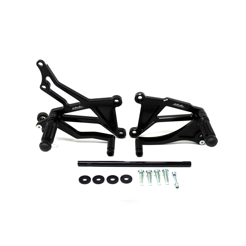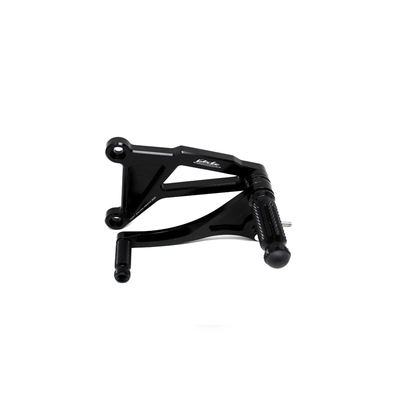 Interamente realizzate in Ergal 7075 T5 lavorato su centri di lavoro CNC questo modello di pedane è stato sviluppato per un uso stradale e pista. I poggiapiedi e i puntalini in alluminio sono lavorati per garantire un grip ottimale. La leva freno è montata su 2 cuscinetti a sfera per ridurre al minimo l'attrito. Il kit comprende tutta la viteria necessaria per il montaggio, l'asta cambio della corretta lunghezza e gli snodi sferici lato cambio e lato freno. Per le pedane VMC sono sempre disponibili tutti i ricambi. Possibilità di montare le alette paratacco.