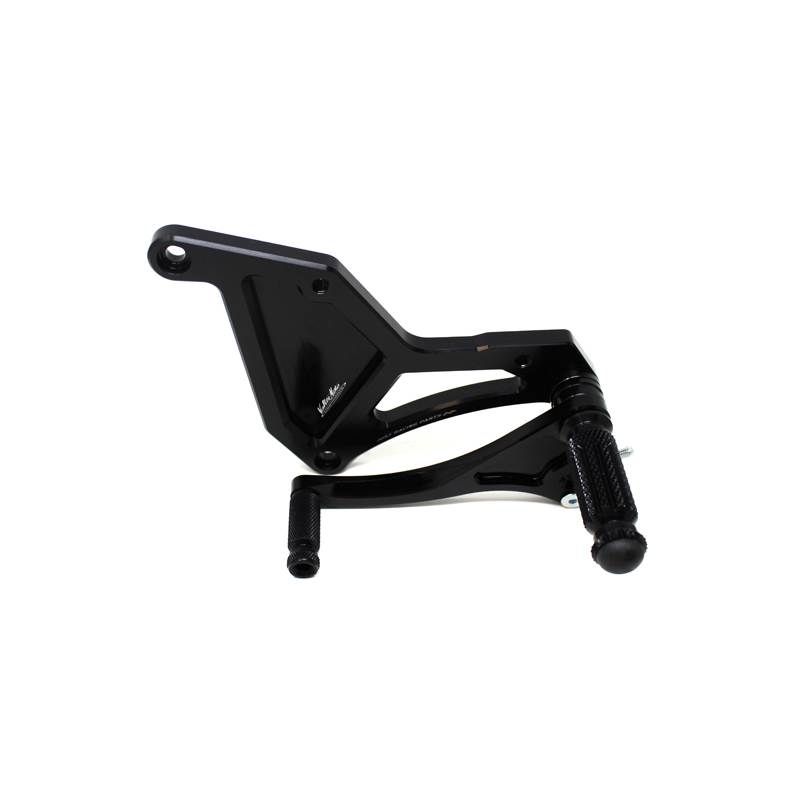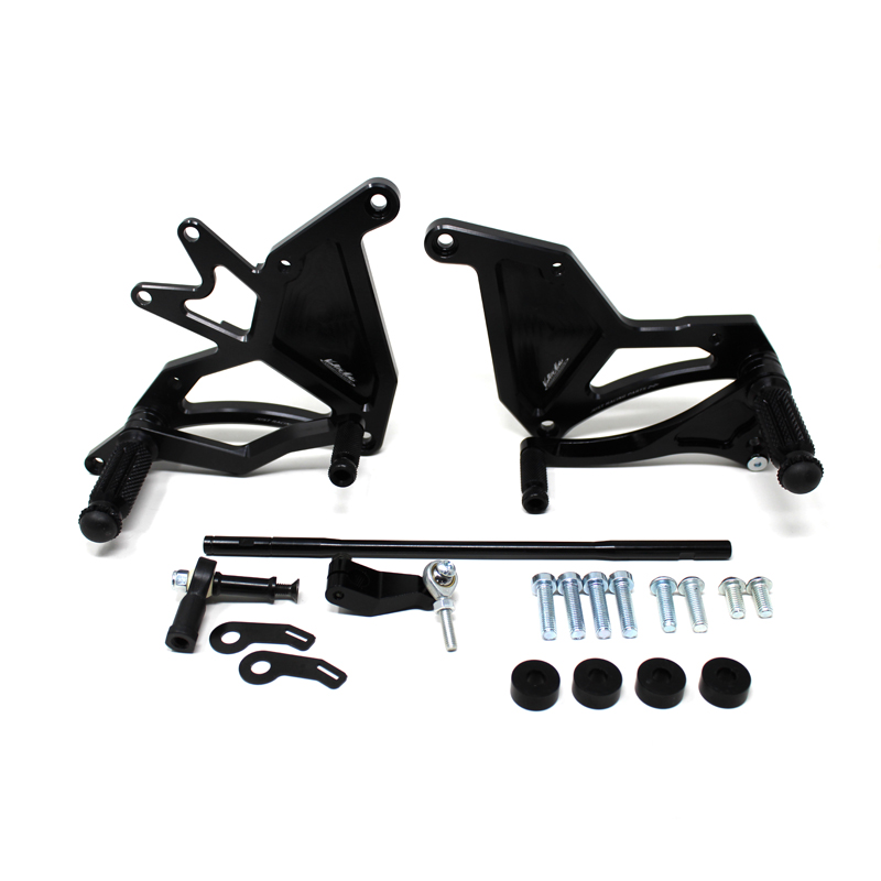 Interamente realizzate in Ergal 7075 T5 lavorato su centri di lavoro CNC questo modello di pedane è stato sviluppato per un uso stradale e pista. I poggiapiedi e i puntalini in alluminio sono lavorati per garantire un grip ottimale. Leve cambio e freno sono montate entrambe su 2 cuscinetti a sfera per ridurre al minimo l'attrito. Il kit comprende tutta la viteria necessaria per il montaggio, l'asta cambio della corretta lunghezza e gli snodi sferici lato cambio e lato freno. Questo modello di pedane prevede l'utilizzo monoposto ed il kit piastre pedane passeggero è venduto separatamente. Per le pedane VMC sono sempre disponibili tutti i ricambi. Possibilità di montare le alette paratacco. Passeggero escluso.