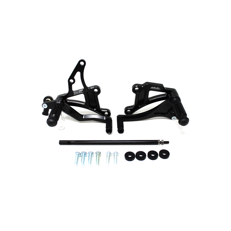 Interamente realizzate in Ergal 7075 T5 lavorato su centri di lavoro CNC questo modello di pedane è stato sviluppato per un uso stradale e pista. I poggiapiedi e i puntalini in alluminio sono lavorati per garantire un grip ottimale. La leva freno è montata su 2 cuscinetti a sfera per ridurre al minimo l'attrito. Il kit comprende tutta la viteria necessaria per il montaggio, l'asta cambio della corretta lunghezza e gli snodi sferici lato cambio e lato freno. Per le pedane VMC sono sempre disponibili tutti i ricambi. Possibilità di montare le alette paratacco.