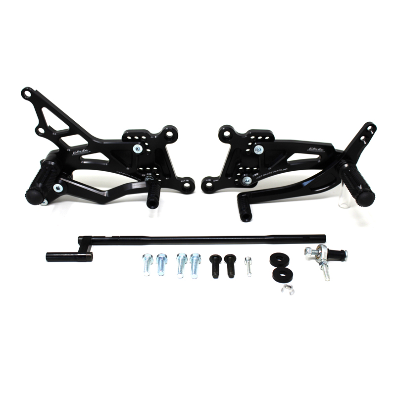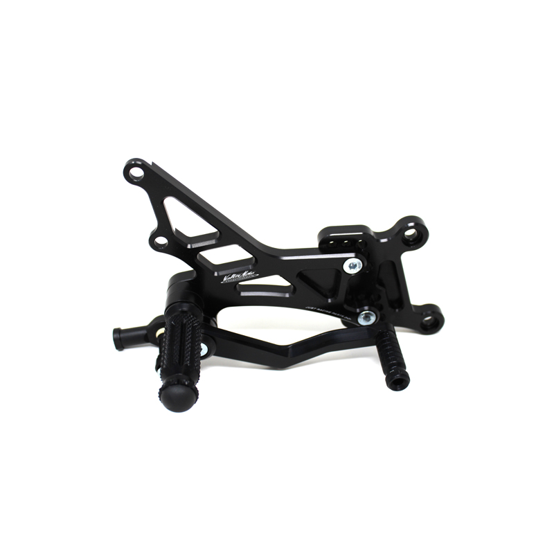 Interamente realizzate in Ergal 7075 T5 lavorato su centri di lavoro CNC questo modello di pedane è stato sviluppato per un uso stradale e pista. I poggiapiedi e i puntalini in alluminio sono lavorati per garantire un grip ottimale. La leva freno è montata su 2 cuscinetti a sfera per ridurre al minimo l'attrito. Il kit comprende tutta la viteria necessaria per il montaggio, l'asta cambio della corretta lunghezza e gli snodi sferici lato cambio e lato freno. Per le pedane VMC sono sempre disponibili tutti i ricambi. Possibilità di montare le alette paratacco.