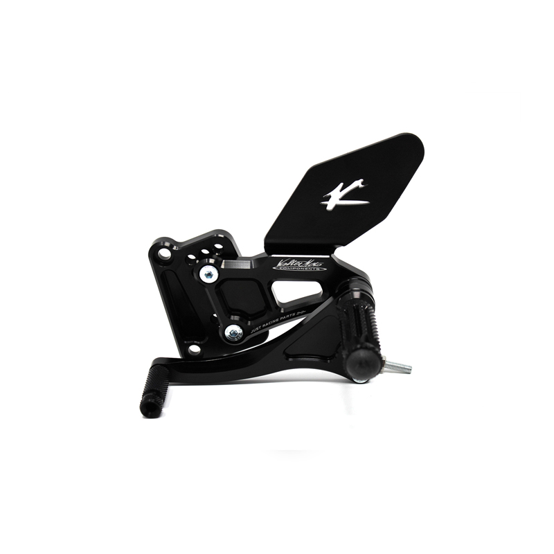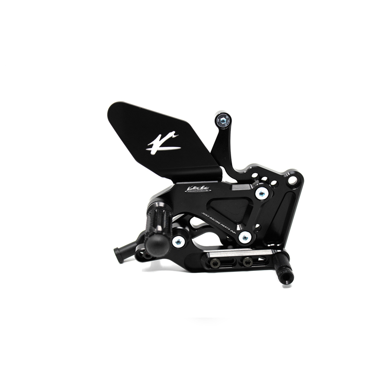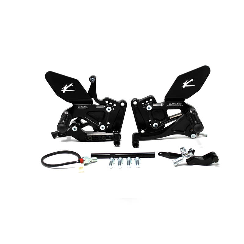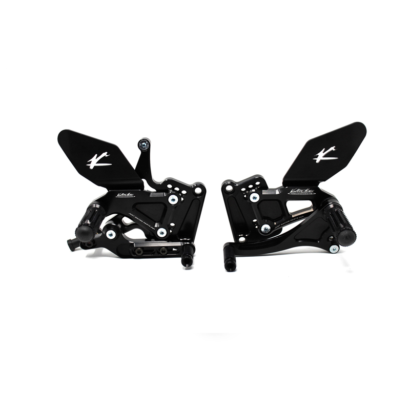 Le pedane regolabili Tipo 1.5 sono interamente realizzate in Ergal 7075 T5 lavorato su centri di lavoro CNC ed il loro utilizzo è consigliato per strada e pista. I poggiapiedi e i puntalini in alluminio sono lavorati per garantire un grip ottimale. Le leve cambio e freno sono entrambe montate su 2 cuscinetti a sfera per ridurre al minimo l'attrito. Le piastre regolabili permettono da 6 a 9 posizioni diverse delle pedane consentendo di trovare il miglior set-up per il proprio stile di guida. Il kit comprende le alette paratacco in alluminio, tutta la viteria necessaria per il montaggio, l'asta cambio della corretta lunghezza, gli snodi sferici lato cambio e lato freno e l'interruttore a pressione per la luce stop. Per le pedane VMC sono sempre disponibili tutti i ricambi.
