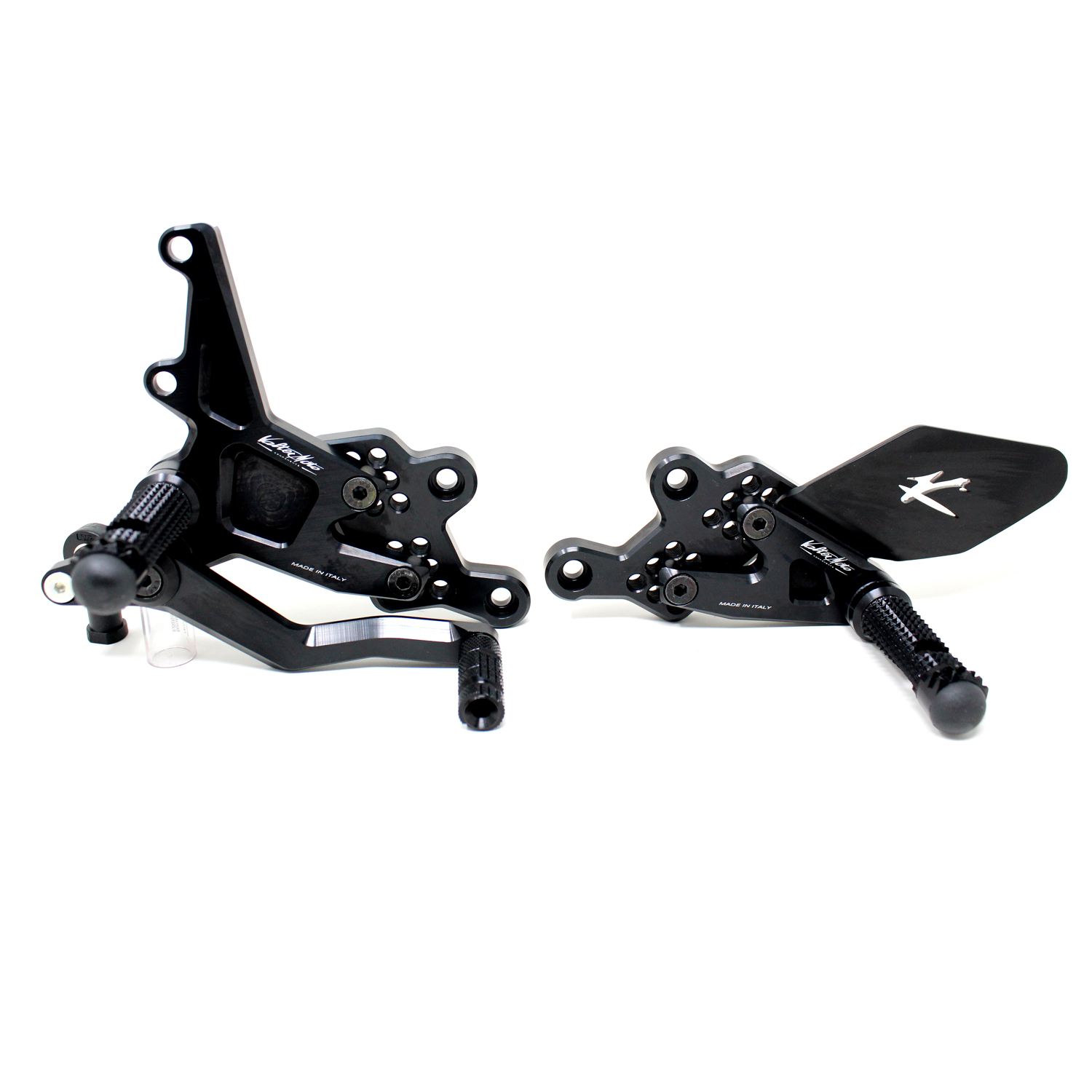 Le pedane regolabili Tipo 1.5 sono interamente realizzate in Ergal 7075 T5 lavorato su centri di lavoro CNC ed il loro utilizzo è consigliato per strada e pista. I poggiapiedi e i puntalini in alluminio sono lavorati per garantire un grip ottimale. Le leve cambio e freno sono entrambe montate su 2 cuscinetti a sfera per ridurre al minimo l'attrito. Le piastre regolabili permettono da 6 a 9 posizioni diverse delle pedane consentendo di trovare il miglior set-up per il proprio stile di guida. Il kit comprende le alette paratacco in alluminio, tutta la viteria necessaria per il montaggio, l'asta cambio della corretta lunghezza, gli snodi sferici lato cambio e lato freno e l'interruttore a pressione per la luce stop. Per le pedane VMC sono sempre disponibili tutti i ricambi. Pedana senza cavalletto moto.
