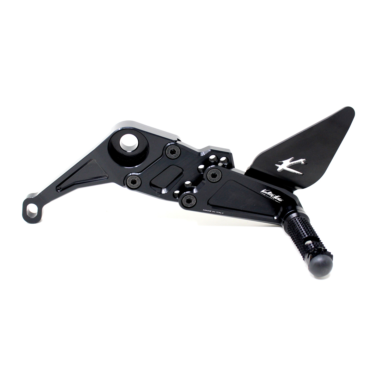 Le pedane regolabili Tipo 1.5 sono interamente realizzate in Ergal 7075 T5 lavorato su centri di lavoro CNC ed il loro utilizzo è consigliato per strada e pista. I poggiapiedi e i puntalini in alluminio sono lavorati per garantire un grip ottimale. Le leve cambio e freno sono entrambe montate su 2 cuscinetti a sfera per ridurre al minimo l'attrito. Le piastre regolabili permettono da 6 a 9 posizioni diverse delle pedane consentendo di trovare il miglior set-up per il proprio stile di guida. Il kit comprende le alette paratacco in alluminio, tutta la viteria necessaria per il montaggio, l'asta cambio della corretta lunghezza, gli snodi sferici lato cambio e lato freno e l'interruttore a pressione per la luce stop. Per le pedane VMC sono sempre disponibili tutti i ricambi. E' necessario montare la pedana senza cavalletto (uso pista).