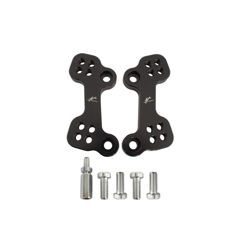 Le piastre di arretramento pedane originali VMC hanno una predisposizione di 2-4 posizioni che permettono di arretrare ed alzare le pedane di 25/30 mm per ottenere un miglior feeling con i comandi. Le piastre sono interamente ricavate dal pieno in Ergal 7075 e vengono lavorate con centri di lavoro a controllo numerico CNC. Insieme alle piastre viene fornita una prolunga per l'asta cambio originale per evitare che debba essere sostituita.