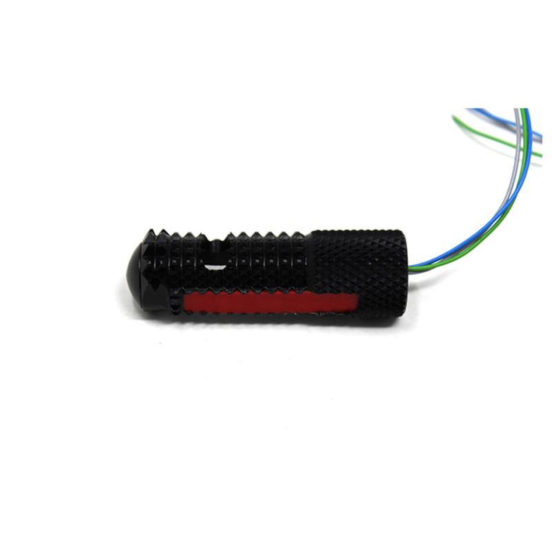 Poggiapiedi che deriva direttamente dal modello adottato per le pedane top gamma 3.5 di VMC ed al momento può essere utilizzato esclusivamente sulle pedane VMC. Il poggiapiedi è realizzato in alluminio lavorato CNC. All’interno dei poggiapiedi è inserito un circuito di illuminazione a micro led ad alta luminosità protetto da una cover trasparente di colore rosso. Questo dispositivo comprende sia la funzione di luce di posizione che quella più luminosa dello stop