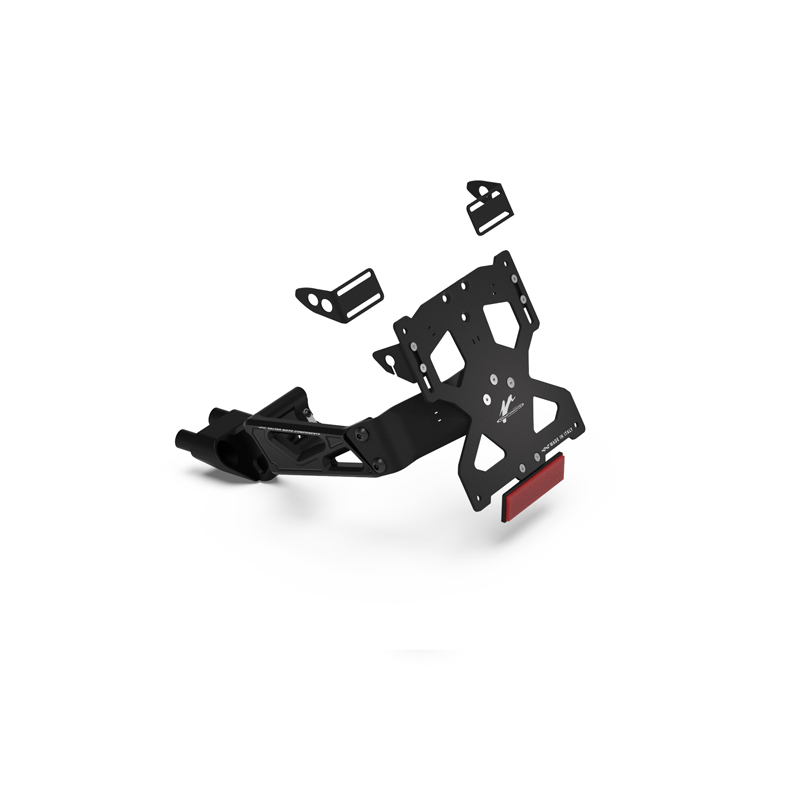 Il portatarga KING sviluppato da VMC permette di spostare la posizione della targa da sotto il codone alla zona vicina alla ruota posteriore. Il sistema di fissaggio al forcellone è realizzato in Ergal 7075 lavorati dal pieno con macchine CNC. Il sistema di montaggio offre diverse possibilità di regolazione della piastra portatarga per trovare il posizionamento desiderato. Nella confezione è inoltre incluso il cablaggio per connettere la luce targa e le frecce all'impianto della moto. Il kit di montaggio incluso comprende tutti i componenti necessari per il montaggio. Viene fornita anche una piastrina in acciaio per coprire il foro lasciato sotto il codone dal portatarga di serie. La luce in alluminio led è inclusa. (PRTL03) colore nero.
