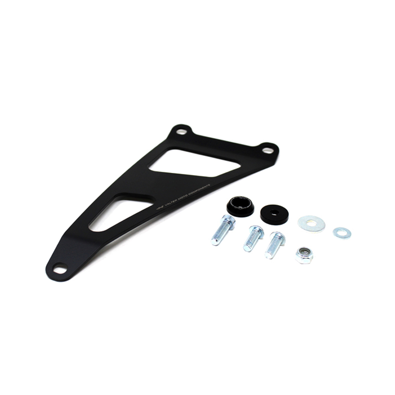 La staffa supporto silenziatore VMC è realizzata in robusto acciaio ed è di facile montaggio al posto di quella di serie. È più leggera della staffa originale e viene fornita con un distanziale conico in alluminio marchiato VMC per il fissaggio del silenziatore.