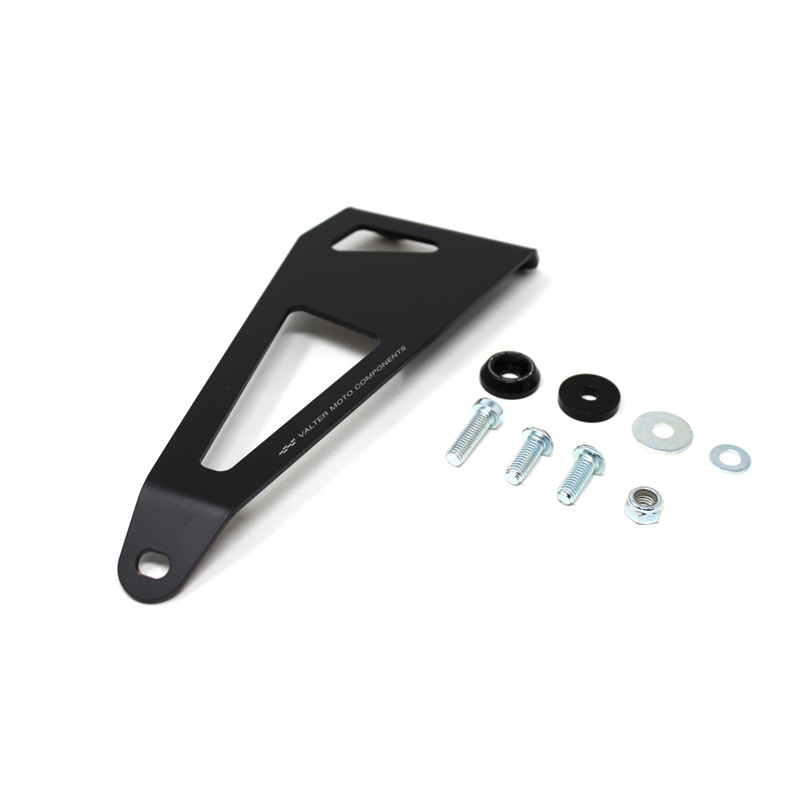 La staffa supporto silenziatore VMC è realizzata in robusto acciaio ed è di facile montaggio al posto di quella di serie. È più leggera della staffa originale e viene fornita con un distanziale conico in alluminio marchiato VMC per il fissaggio del silenziatore.