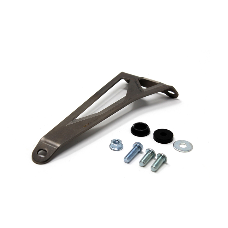 La staffa supporto silenziatore VMC è realizzata in Titanio ed è stata sviluppata in collaborazione con Team professionali per ottenere il miglior rapporto peso/robustezza. Le finiture di alleggerimento della staffa sono effettuate con macchine a controllo numerico CNC per una lavorazione di massima precisione. Non sono richieste modifiche e la staffa è di facile montaggio al posto di quella di serie. È notevolmente più leggera della staffa originale e viene fornita con un distanziale conico in alluminio marchiato VMC per il fissaggio del silenziatore.