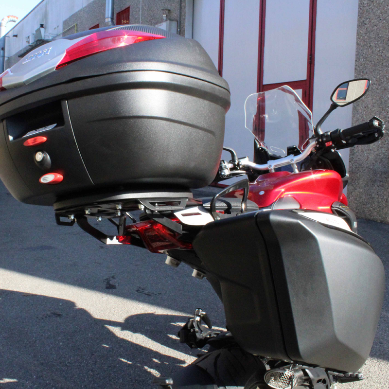 I supporti borse laterali VMC sono realizzati in acciaio resistente di alto spessore. Questi supporti borse sono stati sviluppati per evitare che le borse morbide possano entrare in contatto con la ruota posteriore danneggiandosi e creando una situazione di pericolo. Il prodotto è sviluppato per ogni singolo modello di moto permettendo un montaggio facile che non richiede alcuna modifica. Il supporto borse permette di installare i bauletti dei principali leader del mercato per un peso massimo di trasporto 3KG. Il prodotto è compatibile con il montaggio dei bauletti laterali originali per ottenere un tris di valige. Sono incluse le maniglie passeggero. (HND10)