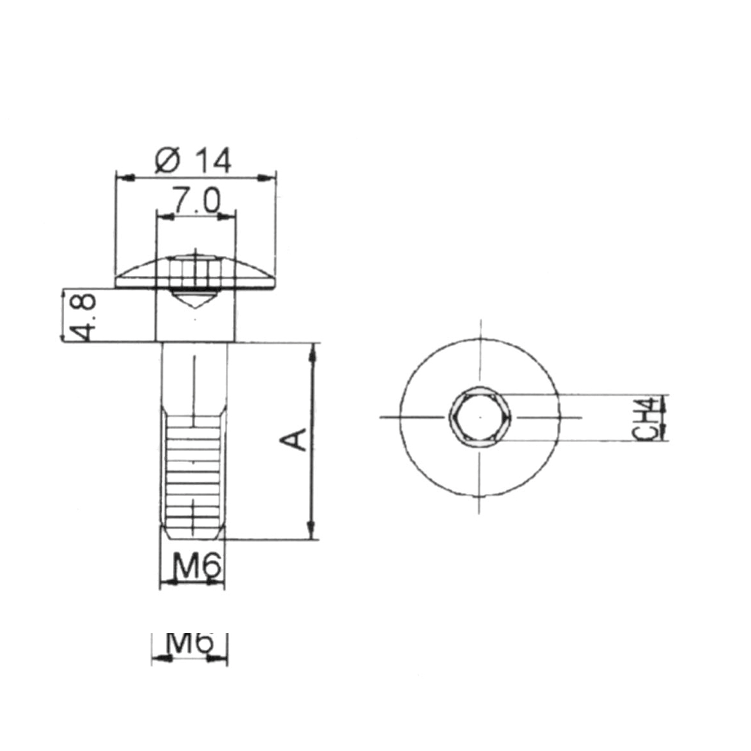 Vite con testa bombata a brugola con spessore sottotesta. Diametro 14mm, filetto M6, lunghezza 20mm, sottotesta 4.8mm. Le viti VMC sono realizzate da barra in alluminio 6082 lavorata su torni a controllo numerico.