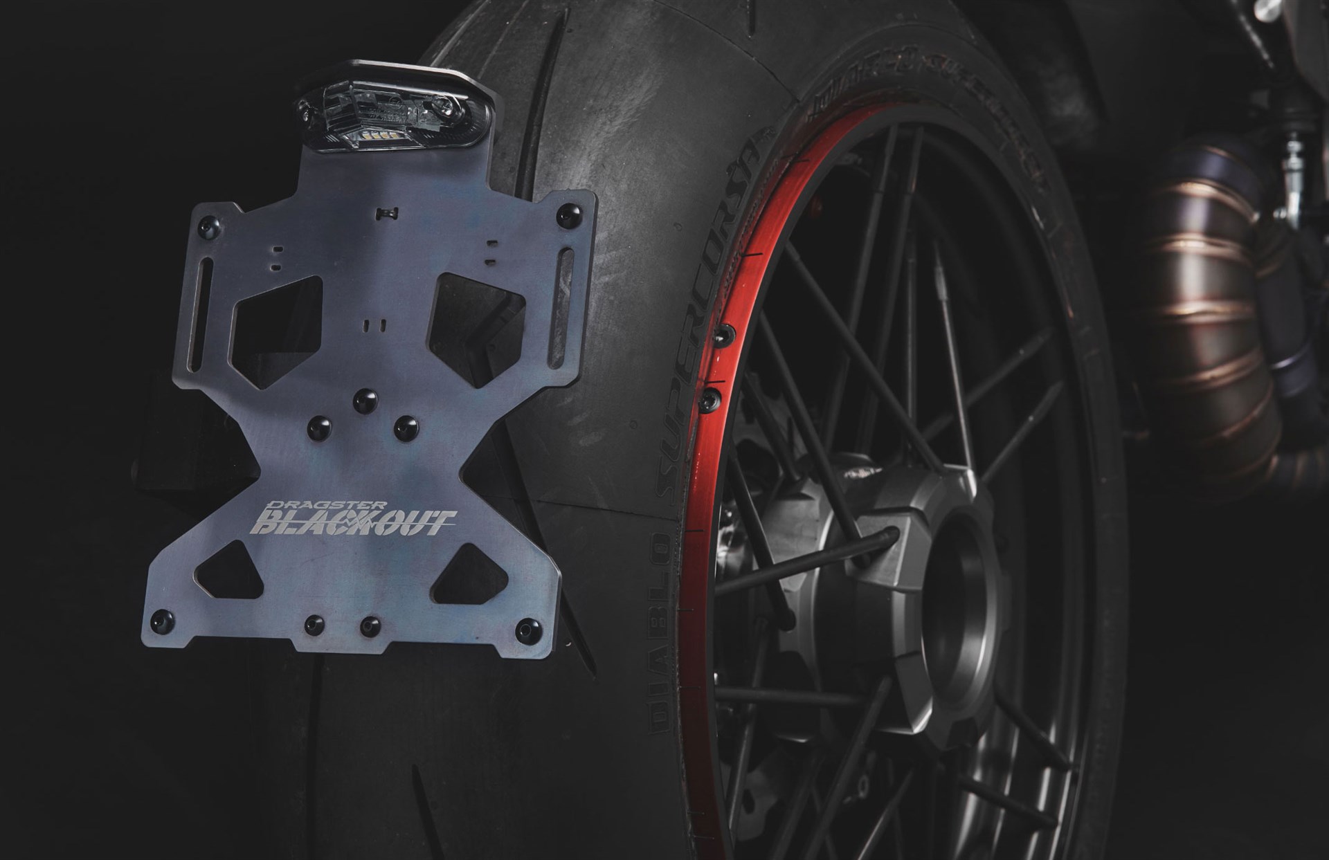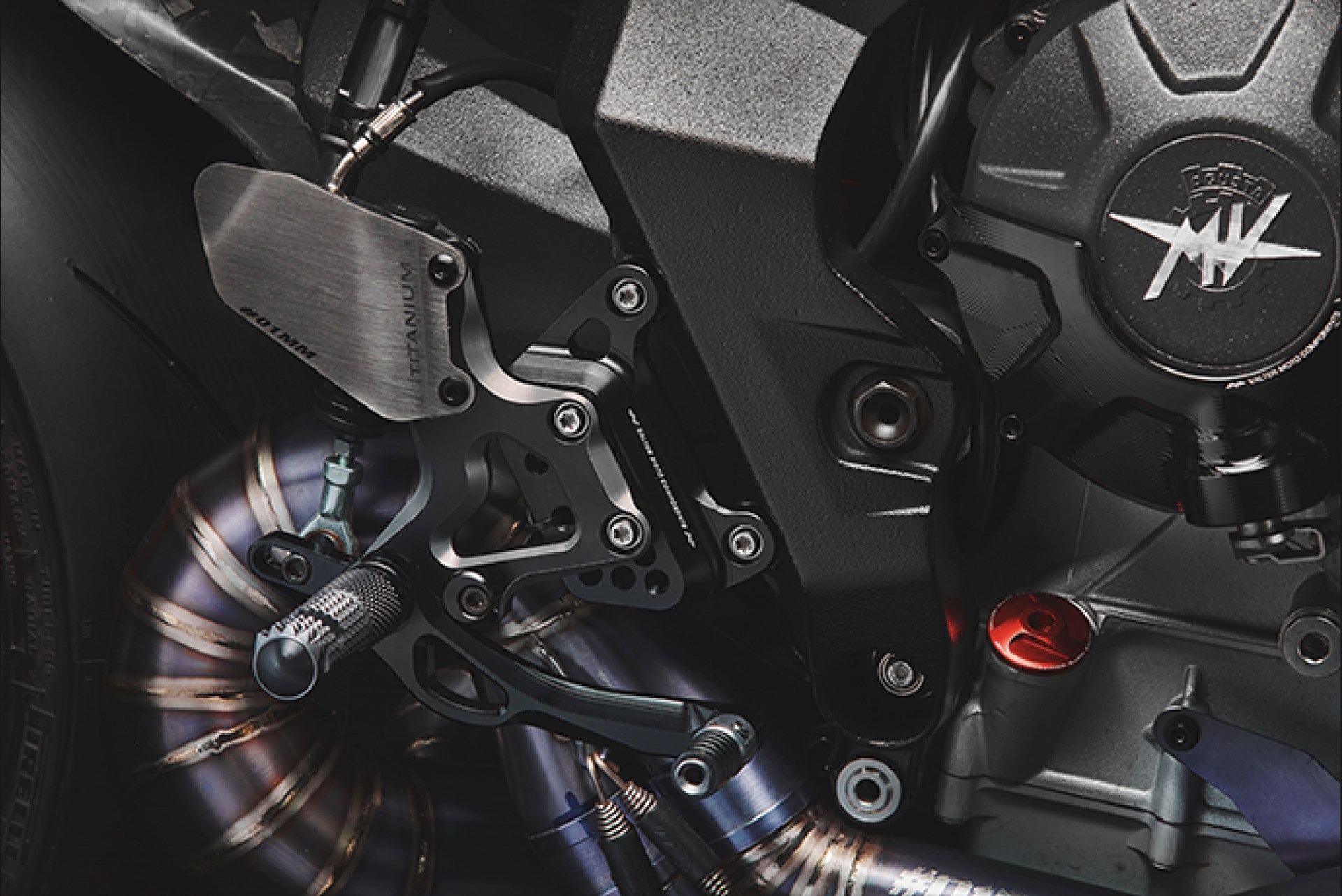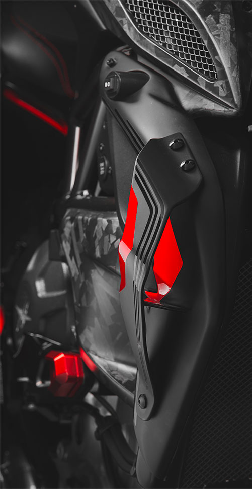 Nella parte centrale sono state aggiunte delle appendici aerodinamiche posizionate sui fianchetti. Le pedane Valter Moto Components hanno un sistema led inserito nei poggiapiedi, che comprende luce diposizione e stop ed integrano una pompa freno racing, eliminando così la pompa originale posizionata sotto il motore. La marmitta è stato completamente ridisegnata; tre scarichi reverse con sistema APS (anti pressure system) sono stati realizzati da Fresco specialista nella lavorazione della marmitte in titanio.
